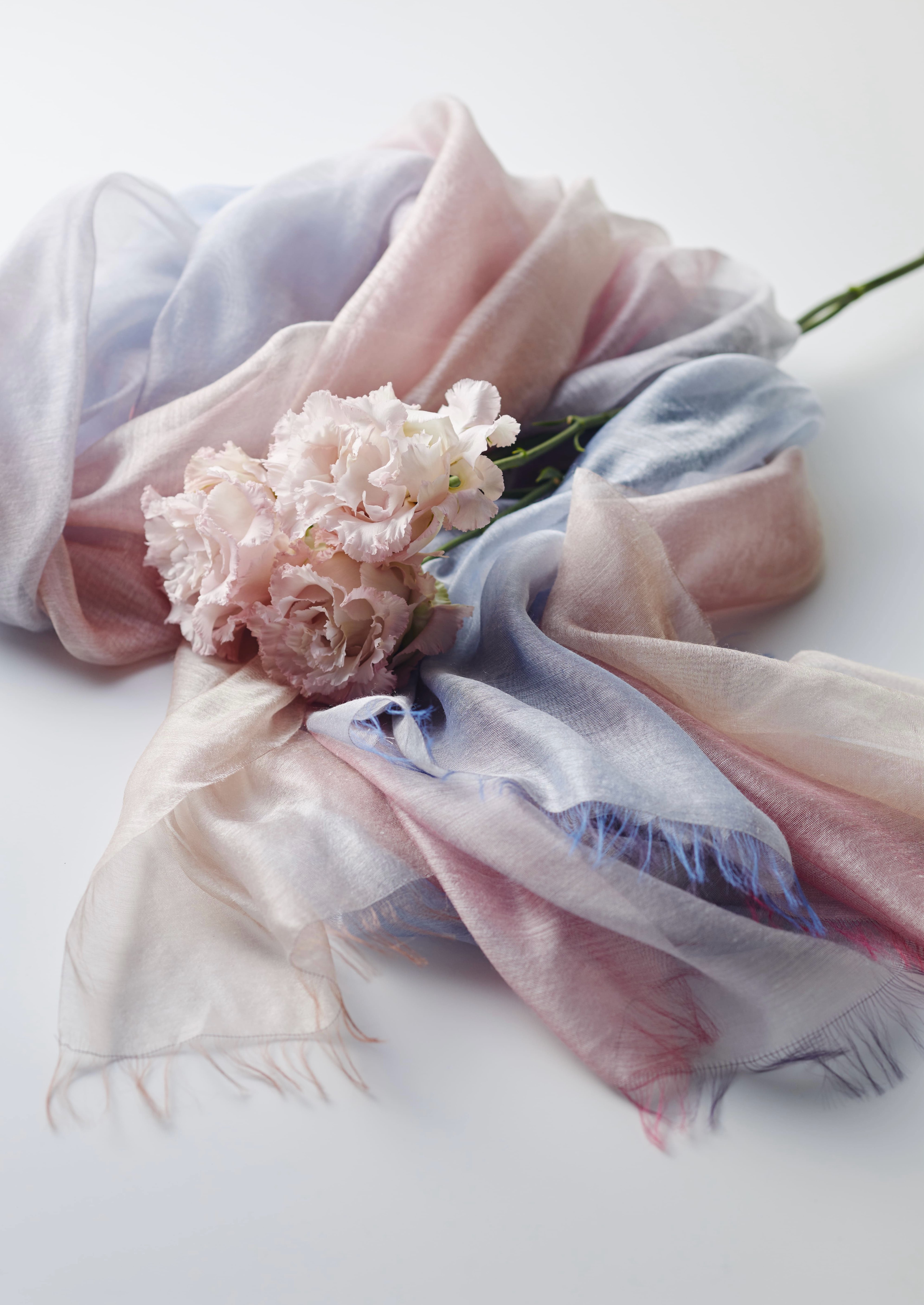 Dying yarns before weaving, the color is clear like light, and its lightness is like even bigger size can be folded in the hand. This is the reason why our stole is one and only.